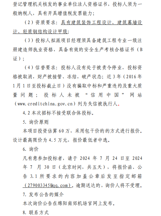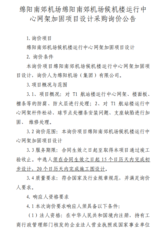 綿陽南郊機(jī)場綿陽南郊機(jī)場候機(jī)樓運行中心網(wǎng)架加固項目設(shè)計采購詢價公告