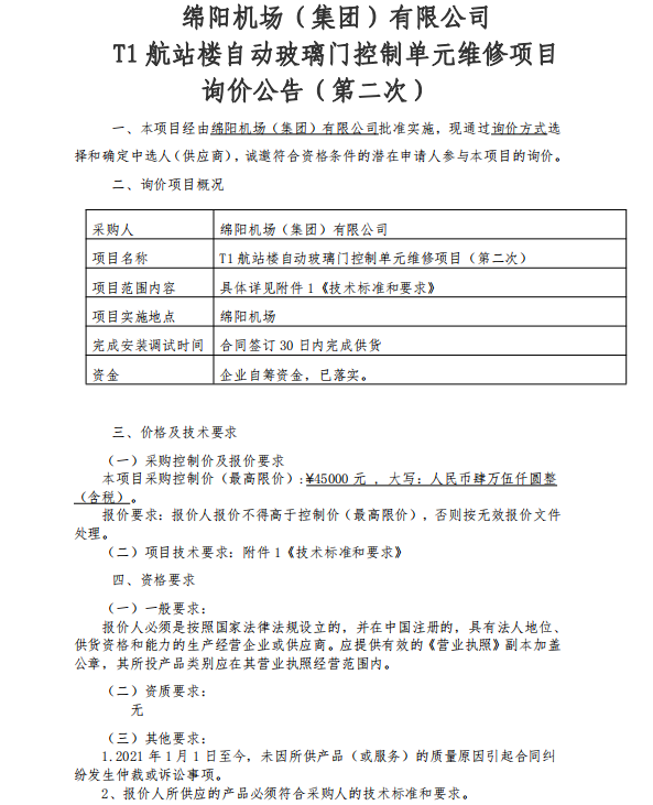 綿陽(yáng)機(jī)場(chǎng)(集團(tuán))有限公司 T1 航站樓自動(dòng)玻璃門(mén)控制單元維修項(xiàng)目詢價(jià)公告(第二次)